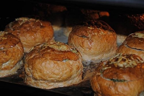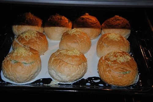 A zsemléket okosan (el ne ázzanak!) meglocsoljuk tejjel, majd betöltjük a tölteléket. Tepsire helyezzük őket. Ha megvan mind a 12, a kalapokat is meglocsoljuk tejjel, a helyükre tesszük, megszórjuk őket reszelt sajttal. Öntünk alájuk egy kis tejet, és betoljuk a sütőbe.