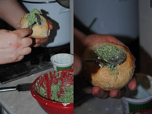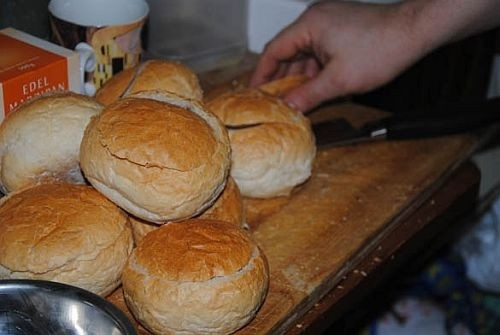 Először is szükséged lesz 12 darab szikkadt zsemlére. (Én konkrétan a munkahelyi büfénkből kértem tegnapit.) „Kalapjukat” éles késünkkel lenyisszantjuk, a belüket kibányásszuk, ügyelve, hogy a zsemlék sértetlenek maradjanak.