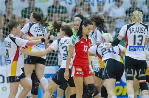 Fotó: MTI - A magyar Görbicz Anita (k) hagyja el pályát, mögötte a német csapat örül
