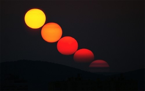 Egy átlagos napnyugta-fotóban sok különleges nincsen, legfeljebb a készítője számára jelenthet romantikus emléket. Lehet azonban ezt a folyamatot úgy is ábrázolni, hogy abba a szépség mellett egy kis tudományt is csempésszen a fotós. Ha sorozatfelvételt készítünk a lenyugvó Napról, a megfelelő időközönként exponált képeket egybeillesztve olyan montázst alkothatunk, amelyen megfigyelhető a Nap színének változása.