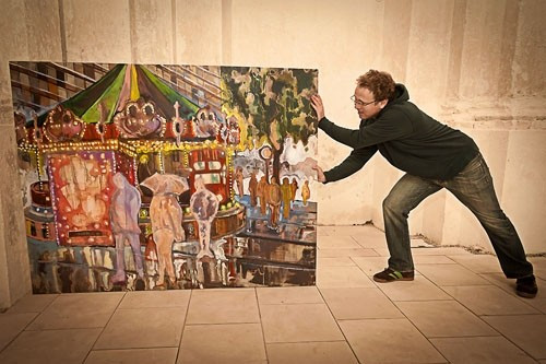 – Két okból is. Egyrészt mindig is vonzott a vidámpark, mint téma. Festettem is már ilyen képet, ami a kiindulópontja a mostani tárlatnak. Másodszor pedig a Jezsuita-templom az egykori vidámpark területén található. Tehát ezzel a kiállítással összekapcsolom a múltat és a jelent.