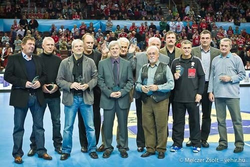 A szünetben az 1985-ös bajnok VÁÉV SE csapatának tagjait köszöntötte a publikum.
