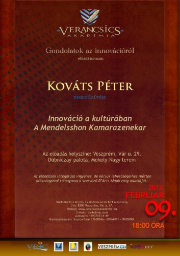 A Verancsics Akadémia “Gondolatok az innovációról” előadás-sorozata folytatódik. Február 9-én, csütörtökön Kováts Péter hegedűművész osztja meg gondolatait a hallgatósággal.