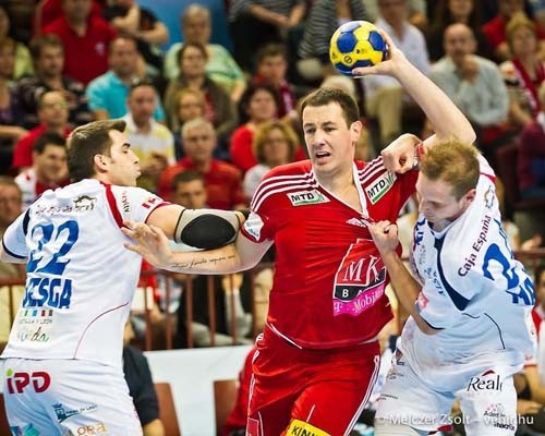 21-30. percig: Alilovic-bravúr után Sulic belőtte ziccerét, hatgólos különbségnél időt kért a hispánok trénere. A folytatásban valamelyest fellazult az MKB védekezése. Az óriási termetű vendég beállós, Baena estében továbbította a játékszert Krivoslikovnak, aki be is lőtte helyzetét. A túloldalon Vujin vette be Alamo kapuját, majd Stranovsky csökkentette ötre a különbséget. Iváncsik kimaradt ziccere után ismét Stranovsky volt eredményes. Öttel a félidei pihenő előtt, Mocsai Lajos kért időt (14:10). Ferrer gólja után Fazekas állt be a veszprémi kapuba. Vujin negyedszer lőtte a spanyol falat. A teljesen vétlen (a labdét blokkoló) Ilyés kapott kétperces büntetést. Terzic eladott labdája után Ruesga csökkentette a hazai fórt. Borges is kiállt, Császár lövése pedig a blokkról pattant be a kapuba. Jó védekezés után fordulhattak a mieink, Ilyés lövése azonban a kapu fölé szállt, a félidőben így 16:12 állt az eredményjelzőn.