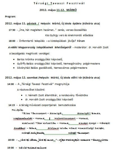 A Pannon Térség Fejlődéséért Közhasznú Alapítvány 2012. május 11-12-én Márkón rendezi meg a Térségi Tavaszi Fesztivált.