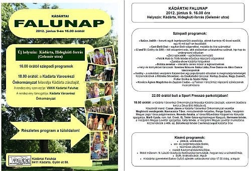 2012. június 9-én, szombaton 16 órától a Hidegkúti-forrásnál tartják a színes programokat kínáló kádártai falunapot.