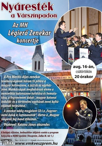 A Magyar Honvédség Légierő Zenekara ad koncert augusztus 16-án 20 órától a Nyáresték a Várszínpadon programsorozat részeként.