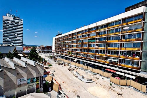Ha erről a pontról végignézünk a Kossuth utcán, egyértelműen szembeötlő a kettősség. A bal oldalon ronda, de egyeseket mégis nosztalgiával elöntő (azaz retro) épületek állnak, amiket a valójában tizenkilenc emeletes "húszemeletes" koronáz meg. Ezeket a hatalmas dobozokat még a szocializmus idejében rakták ide, lerombolva Veszprém régi épületeit. Szerencsére nem sikerült teljes munkát végezniük, ezért az utca jobb oldalán megmaradtak a régi polgári („pre-retro”, vagy esetleg „pretro”) stílusban.