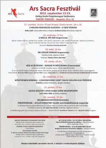 Az ünnepi programok szeptember 15-én, szombaton 16 órakor az Érseki hivatal Gizella termében kezdődnek Kolba Judit művészettörténész előadásával A Magyar koronázási jelvények címmel. Az előadáson Szelényi Károly fotóművész képei láthatók.