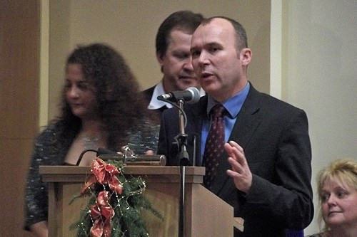 A szórakoztató dalokból álló zenés blokk után Porga Gyula, Veszprém polgármestere köszöntötte az egybegyűlteket. Elmondta, a karácsony idején, mikor együtt van a család, az emberek nyitottsággal fordulnak egymás felé. A polgármester kiemelte, egy város akkor működőképes, ha a generációk és a közösségek figyelnek egymásra, igyekeznek egy olyan harmóniát létrehozni, amit itt tapasztalhattunk, hiszen az ünnepségen fellépő zenészek között képviseltette magát a felnőttek és a gyerekek korosztálya is, több generáció volt együtt teljes összhangban. A politikus felhívta az ottlévők figyelmét, fontos lélekben fiatalnak és derűsnek maradni, hogy jó hangulatban teljen a karácsony.