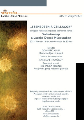 A magyar költészet legszebb szerelmes verseiből összeállított irodalmi műsor előadója Dominek Anna Kazinczy-díjas színésznő, gitáron közreműködik Farkasréti György. A program felvezetőjeként Dr. Janka Ferenc veszprémi görög katolikus parókus osztja meg gondolatait a hallgatósággal.