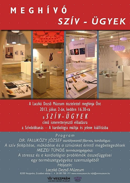 A Semmelweis Orvostörténeti Múzeum Szívdobbanás – A kardiológia múltja és jelene című vándorkiállítása július 22-ig tekinthető meg a Laczkó Dezső Múzeumban. A kiállításhoz kapcsolódóan kedden 16:30-tól előadást tartanak, ahol dr. Faluközy József osztályvezető főorvos, kardiológus a szív felépítéséről, működéséről és a szívünket érintő megbetegedésekről beszél, Mezei Tünde természetgyógyász pedig a stressz és a kardiológiai problémák összefüggéseit tárja fel egy természetgyógyász szemszögéből.