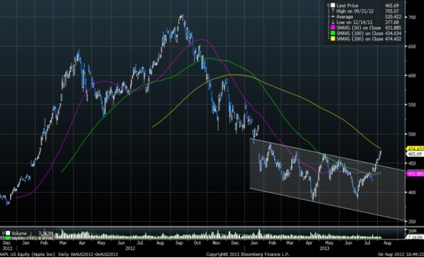 Az elmúlt fél év árfolyam alakulása komoly fejfájást okozhatott a társaság részvényesei számára, hiszen a papír árfolyama az éve eleje óta csökkenő trendben mozgott. A társaság július 23.-án tette közzé második negyedéves gyorsjelentését, ami összességében felülmúlta az elemzői várakozásokat. Az, hogy a társaság hozni tudta a várt számokat az a cég ”zászlóshajójának” az iPhone-nak köszönhető, amiből vártnál többet tudtak értékesíteni. Szám szerint 31,2 millió darabot adtak el, ami közel 20 %-os növekedést jelent a bázishoz képest. A vállalat árbevétele is jól alakult, hiszen a 35 milliárd dolláros elemzői várakozás helyett, 35,3 milliárd dollárt értek el. Továbbá az is jó hatással volt az árfolyamra, hogy tovább duzzadt a cég készpénzállománya, ami az első negyedév végi szinthez képest 9,5 milliárd dollárral emelkedett, annak ellenére, hogy komoly készpénz-visszajuttatási programot hirdetett a társaság három hónappal ezelőtt. A gyorsjelentésből kiderült, hogy tovább csökkent a társaság profitja, de a lejtmenet kisebb volt a vártnál. A profit csökkenésében vastagon benne van, hogy ”csak” 14,6 millió iPad talált gazdára, ami a tavalyi hasonló negyedévhez képest 17 %-os csökkenést jelent. Összességében a nettó eredmény a bázishoz képest 22 %-kal 6,9 milliárd dollárra csökkent, ami részvényenként (EPS) 7,47 dollárt jelent, de így is meghaladta az elemzők által várt 7,30 dollárt.