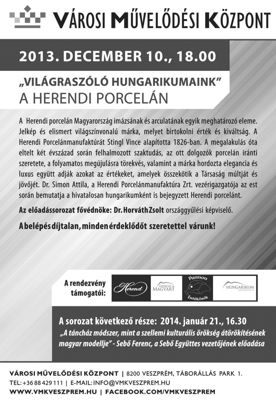 A Herendi Porcelánról tart előadást dr. Simon Attila, a manufaktúra vezérigazgatója december 10-én a VMK-ban.