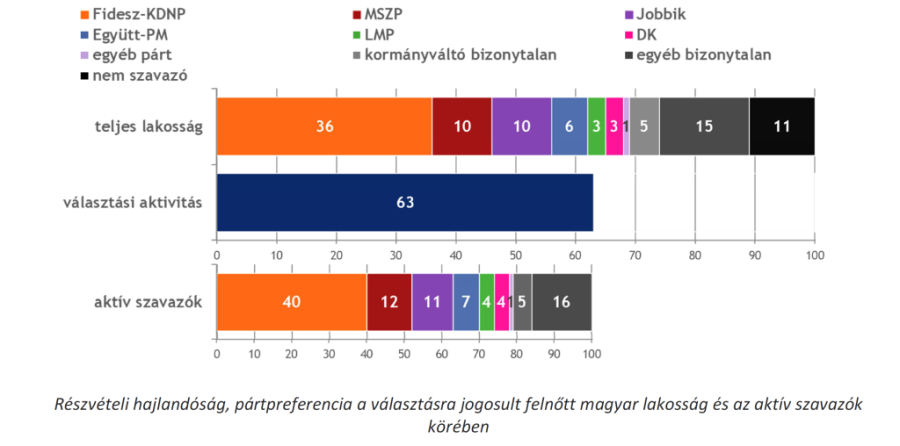 A teljes népesség körében 36 százalék szimpatizál a kormánypártokkal, 10 százalék a Magyar Szocialista Párttal, 6 százalék az Együtt-PM szövetséggel, 3-3 százaléka a Demokratikus Koalícióval és a Lehet Más a Politikával, valamint 10 százaléka a Jobbikkal. Választási aktivitás tekintetében érződik a kampány közelsége, hiszen már most vasárnapra vonatkozóan is 63 százalékos aktivitásra számíthattunk volna. A részvételét biztosra ígérő aktív szavazók körében 40 százalékos a Fidesz-KDNP, 12 százalékos az MSZP, 11 százalékos a Jobbik, 7 százalékos az Együtt-PM, 4-4 százalékos pedig az LMP és a DK tábora.