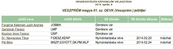 A Nemzeti Választási Iroda valasztas.hu weboldala szerint jelenleg Forgóné Kelemen Judit Andrea, a Jobbik jelöltje; Gerstmár Ferenc, az LMP jelöltje és az Új Magyarország Párt színeiben induló Kozmor Imre Ferenc vár a bizottság döntésére.