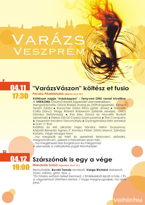 Az egész éves programsorozat április 8-án, kedden kezdődik - ismertette Gecs Mónika szervező, hozzátéve, az első rendezvényeket ráfűzték a költészet napjára. Első nap egy csend sétára várják a kikapcsolódni vágyókat, szerdán az ötéves odaLÖKött KÖLtészet tagjai biztosítják a szórakozást, csütörtökön az Utas és holdvilág antikváriumba szerveznek programokat, pénteken a Fricskában ünneplik a költészet napját, szombaton pedig Szárszónak is egy a vége címmel szerveznek eseményt a Mandorla kávézóba.