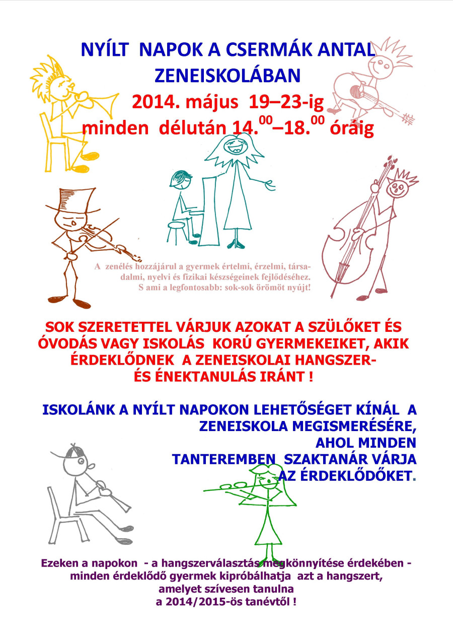 A Csermák Antal Zeneiskola május 19-23. között nyílt napokat tart a zenetanulás iránt érdeklődő diákok és szüleik számára. A tanórák délután 2 és 6 óra között látogathatóak és néhány hangszer kipróbálására is lehetőséget biztosítunk.