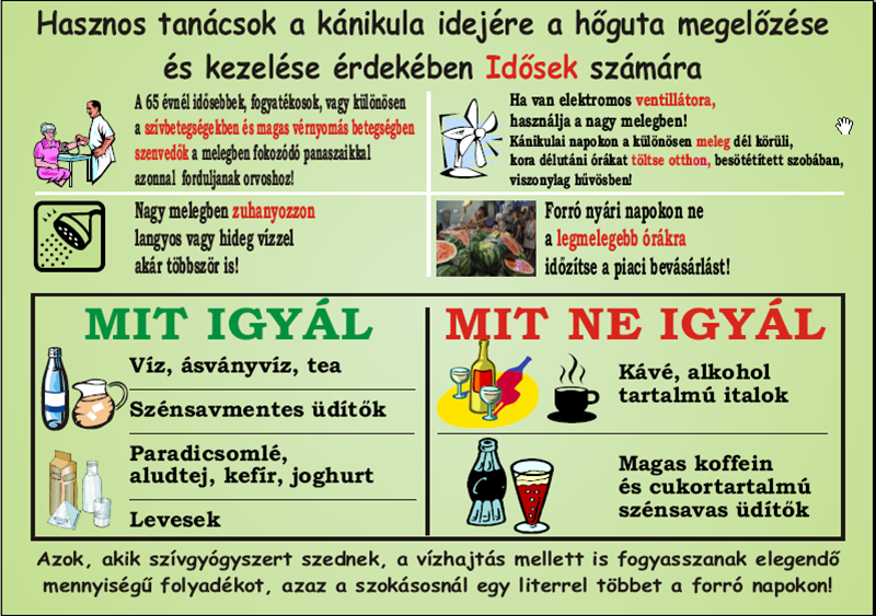 A hőhullám élettani hatásai: hőstresszt, napszúrást és hőgutát okozhat. Kérem a lakosságot, különösen a betegeket, a 0-14 éves korú gyermekeket és az idősebb korosztályt, hogy kerüljék a szabadban tartózkodást és dolgozást, illetve tartózkodjanak minél többet árnyékban vagy hűvös/klimatizált helyiségekben a további információig.