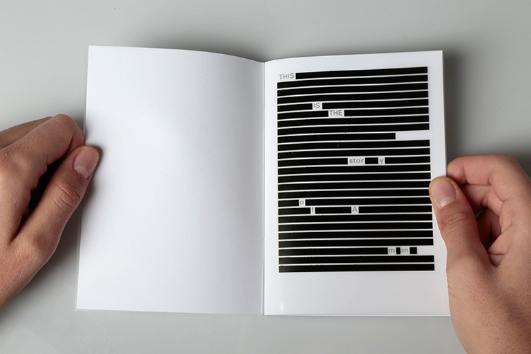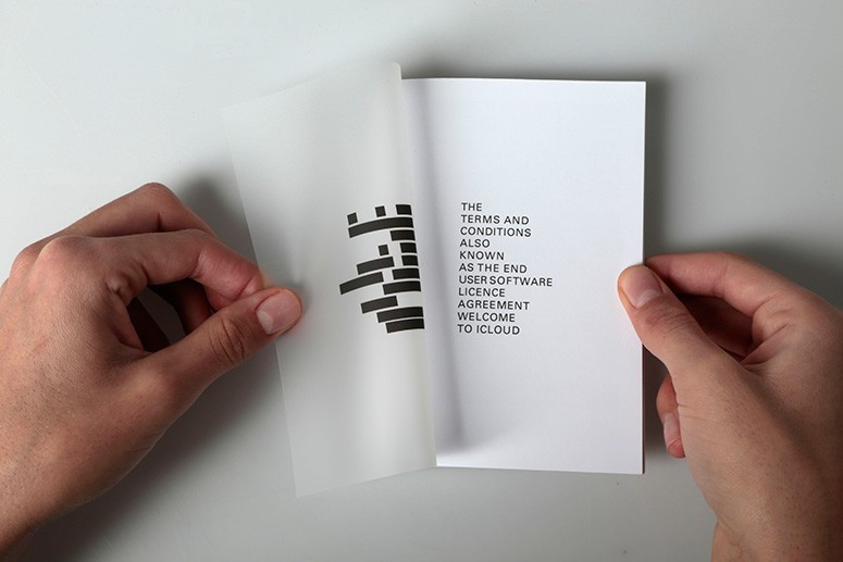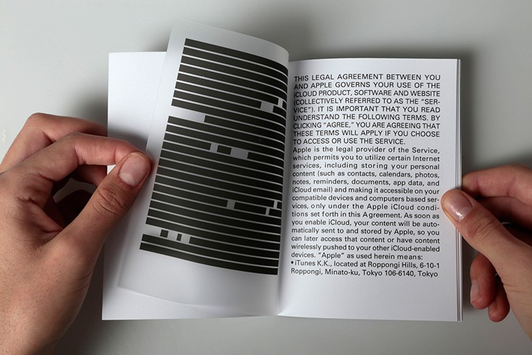 Jessica Mullen az Apple felhőszolgáltatásának felhasználói szerződését nyomtatta ki, az oldalak közé pedig átlátszó fóliákat fűzött be, amelyek kitakarták a szöveg nagy részét. A megmaradt szavakból egy történet áll össze.
