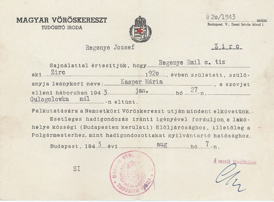 A zirci Regenye Emil utász tizedes orosz harctéren történt eltűnéséről a Magyar Vöröskereszt által írt hivatalos értesítéshez hasonlót egykor sok ezer honfitársunk vehetett kézhez. A kiállítás egyben főhajtás a háború valamennyi katona és civil hőse és áldozata előtt.