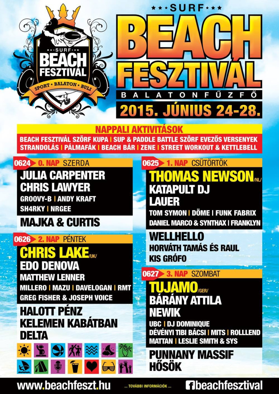 Ismét rengeteg szórakoztató programmal készültek a Beach Fesztivál szervezői. Június 24. és 28. között napközben lágy zene és lazulás mellett, Surf és SUP versenyek, vízi sportbemutatók zajlanak, majd kora este a Beach Party veszi kezdetét.