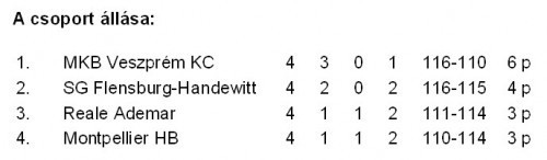 Parádés teljesítménnyel rukkolt elő az MKB Veszprém KC a francia bajnok Montpellier otthonában a Bajnokok Ligája középdöntőjének második meccsén. A bakonyi gárda már az első félidőben háromgólos előnyt harcolt ki a hazai pálya minden előnyét élvező ellenfél ellen, majd a folytatásban is remekelt. A hatvan percen keresztül fantasztikus formában védő Peric támogatásával világklasszis játékot nyújtott Mocsai Lajos együttese. A rendkívül taktikusan, s fegyelmezetten játszó gárda a második játékrészben már kilenc góllal is vezetett, s esélyt sem adott riválisának. A Veszprém hat ponttal rendelkezik, s a továbbjutáshoz már az is elegendő, ha hazai környezetben is két vállra fekteti a Montpellier-t.