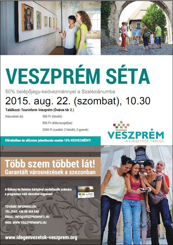 A 10.30 órakor a Tourinform Veszprém elől induló séta során az Óváros térrel és a Veszprémi Várral ismerkedhetnek meg az érdeklődők. Minden résztvevő 50 százalék kedvezményt kap a Szaléziánum Érsekségi Turisztikai Központ belépőjegy árából az idegenvezetés napján, a látogatóközpont nyitva tartási idejében, részvételi jegye felmutatása esetén.