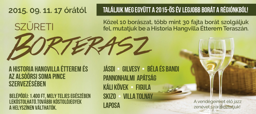 Veszprém megyei borászatok több mint 20 fajta borát mutatjuk be a Historia Hangvilla Étterem Teraszán. Élőzenével és kötetlen borkóstolóval várjuk a kedves vendégeket egy nyárbúcsúztató estére. A belépő 1.400,-Ft mely teljes egészében lefogyasztható. További kóstolójegyek a helyszínen válthatók.