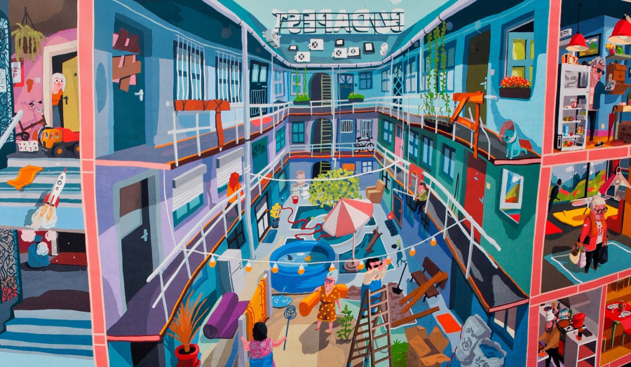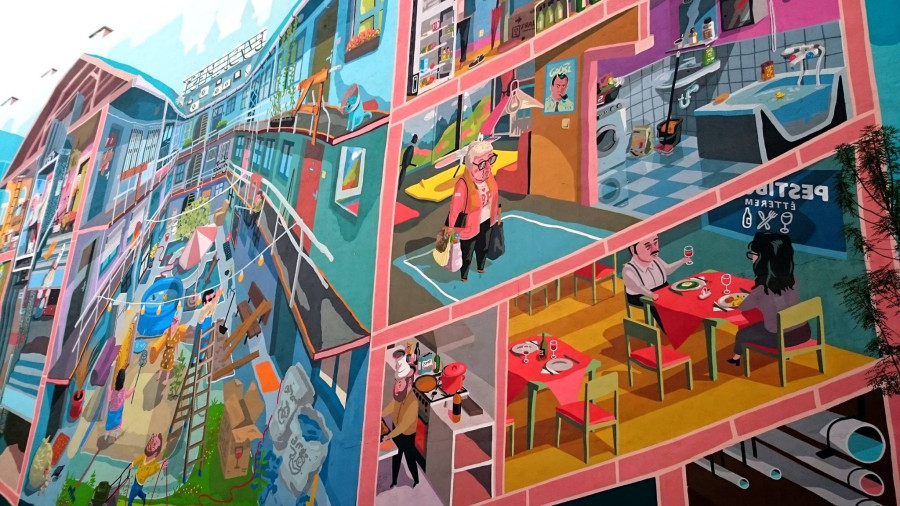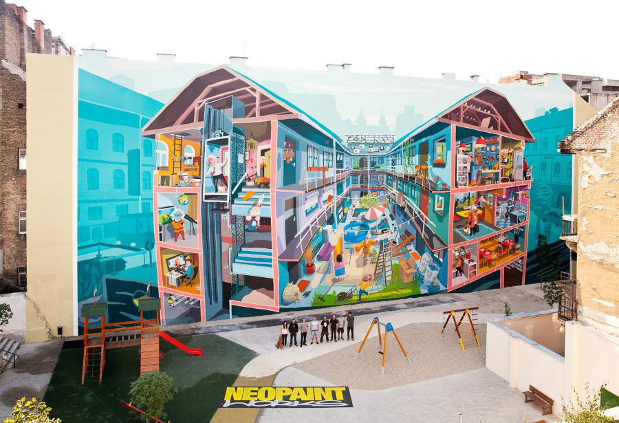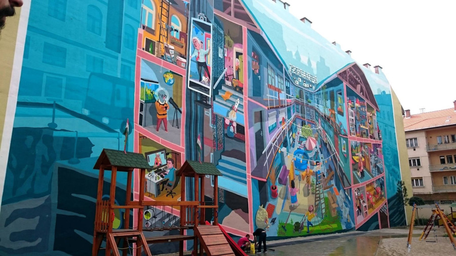 Az erzsébetvárosi Bárdos Lajos Általános Iskola és Gimnázium mögött nemrég elbontottak egy épületet, így egy több mint ezer négyzetméteres falfelület vált láthatóvá. A tűzfalat mindenképpen újra kellett festeni, és végül az a döntés született, hogy az egyszínű vakolat helyett egy falfestménnyel teszik színesebbé az iskolai hétköznapokat. A képet Vidák Zsolt rajza alapján készítették el.