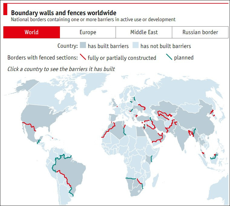 A válogatás közé nem került fel többek között a görögországi, a ciprusi a brazil és a koreai határzár sem, de aki el szeretne mélyedni a világon eddig felhúzott vagy tervezett védelmi vonalai közt, tanulmányozhatja az alábbi képet, melyet a The Economist készített. A piros vonal a részben, vagy teljesen megépített, a zöld a tervezett kerítést jelöli.
