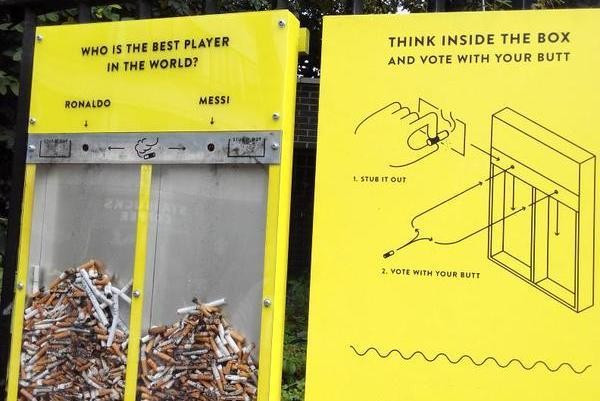 A kihelyezett mókás táblákon oda kell dobni a csikket, ahova a fent említett kérdések szerint valók. Az utcaesprőknek biztosan sok munkát spóroltak meg vele!