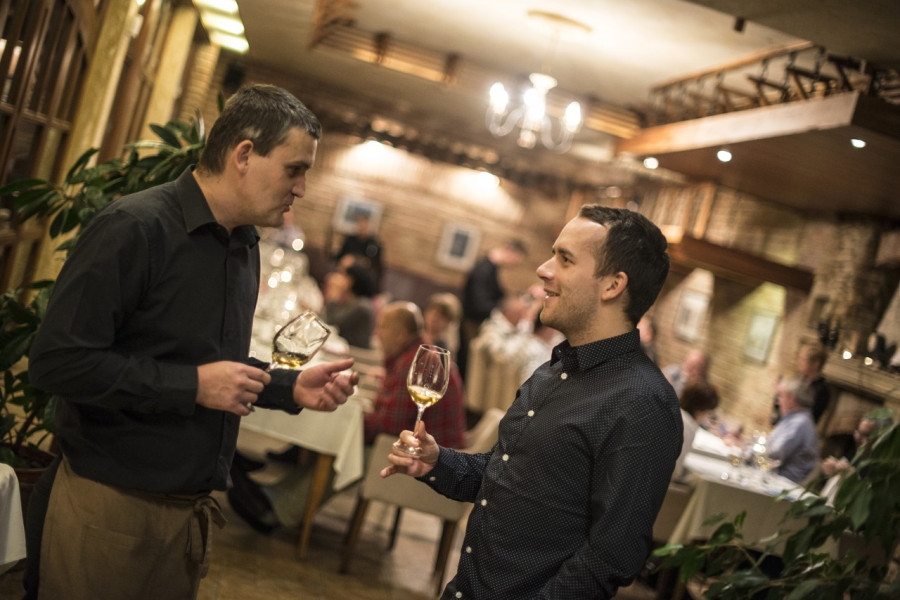 Ahogy az ilyenkor lenni szokott, az est folyamán a könnyebbtől haladtunk a nehezebb ízek felé. Kóstolgatunk, ízlelünk, miközben kedves és figyelmes pincérek sürögnek-forognak körülöttünk szinte észrevétlenül. Kezdésnek pirított diós posírozott osztrigát kapunk zöldalmával és narancsos hollandi mártással, az ételt a Villa Tolnay 2014-es olaszrizlingje kíséri. Itt még érezzük, hogy az elején járunk az estnek, a testesebb ízek később következnek.