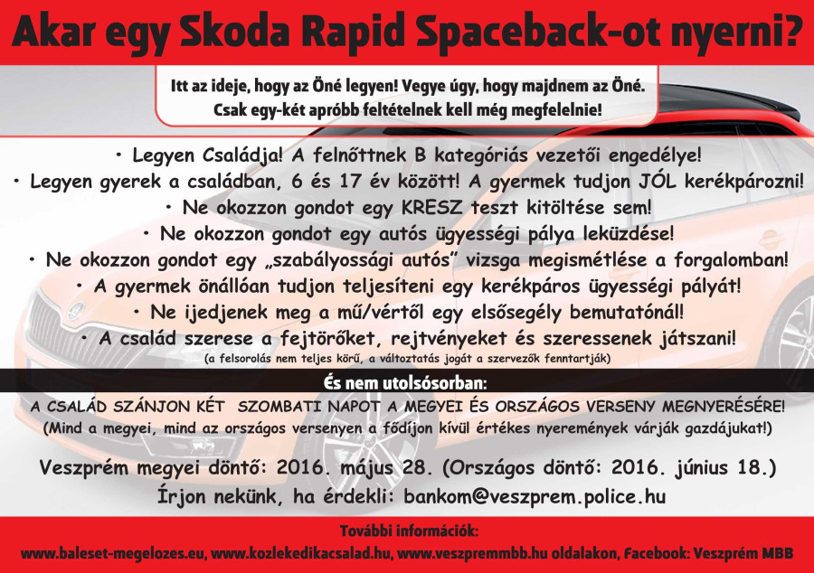 A vállalkozó kedvű családokat mindkét nap reggel 9 órától délután 3 óráig várják a Veszprém Megyei Balesetmegelőzési bizottság standjához. A vetélkedő országos fődíja egy Škoda személyautó.