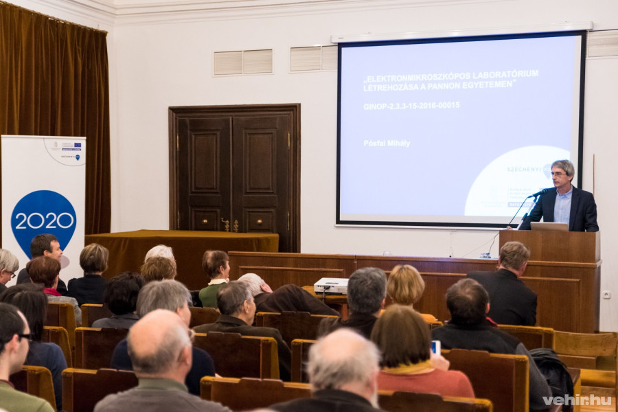 Dr. Pósfai Mihály előadásában kitért a projekt fázisaira, nehézségekre, és választ adott a sokakban felmerülő kérdésre is: hol tart jelenleg a tudomány, ehhez képest mit fog tudni az új veszprémi laboratórium, milyen jellegű vizsgálatokra lesz alkalmas?