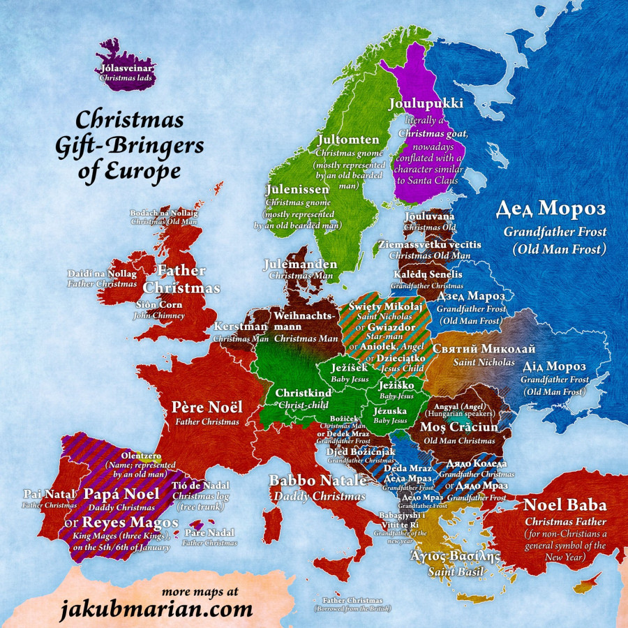 Érdekes, hogy csak a volt Osztrák-Magyar Monarchia területén hoz ajándékot a Jézuska, a legtöbb helyen a ugyanis a Christmas Father/Daddy jön. Az egyik legfurcsább mindenképp az, hogy Katalóniában a Tió de Nadal, azaz maga a karácsonyi fatörzs érkezik szenteste.