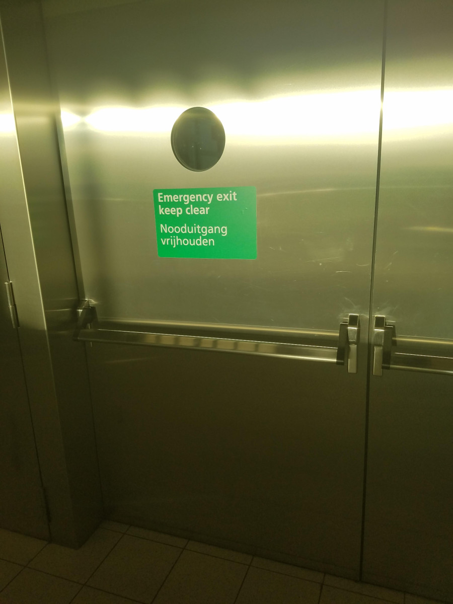 Ha jól megnézzük a Schiphol reptér vészkijáratát, mit látunk? Szép és fényes, rajta egy zöld matrica, ami azt hirdeti, hogy itt kell kérem szépen menekülni vészhelyzet esetén, ezért tartsuk szabadon az útvonalat.