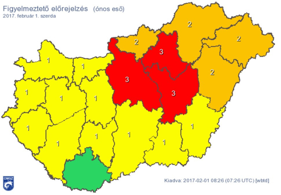 Az Országos Meteorológiai Szolgálat február 1-jére kiadott figyelmeztető előrejelzése szerint az ország döntő részén (a kb. Győr-Budapest-Debrecen vonaltól délre, kivéve a Tiszántúl keleti részét, és a Dunántúl északnyugati részét) jelentős mennyiségű (több mm) ónos eső várható. Szerda hajnaltól előbb a Dél-Dunántúlon, majd a Dél-Alföldön is a nagy területű ónos esőt kezdetben még csak néhol, majd egyre nagyobb területen eső váltja fel a tovább emelkedő hőmérséklet miatt.