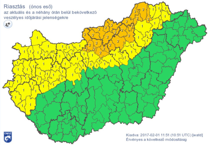 Az Országos Meteorológiai Szolgálat az MTI-hez szerda délben eljuttatott veszélyjelzése szerint Borsod-Abaúj-Zemplén, Heves, Nógrád és Pest megyében másodfokú, Fejér, Győr-Moson-Sopron, Jász-Nagykun-Szolnok, Komárom-Esztergom, Vas, Veszprém és Zala megyében elsőfokú figyelmeztetések és riasztások vannak érvényben az ónos eső veszélye miatt. Ezeken a területeken várható további ónos csapadék, amelyek miatt csúszóssá válhat az útfelület.