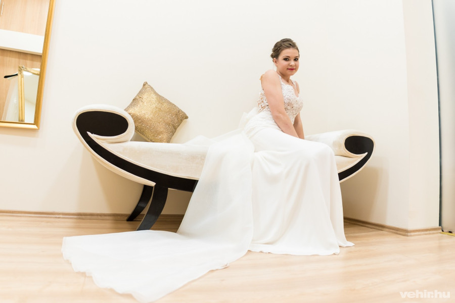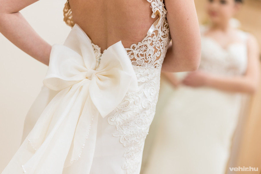 Nem meglepő: a negédes, csipkés, szinte túldíszített csodába könnyű beleszerelmesedni. A szűk fazon ráadásul ma különösen kedvelt a lányok körében, de a ruha legfőbb ékességét a hátkiképzés adja. A hátat szinte teljesen szabadon hagyó ruha felsőrészének hátulját válltól derékig gyönyörű vonalakban csipke szegélyezi, uszályként pedig egy roppant egyszerű, az összképet mégis megkoronázó, hosszan leomló masni szolgál.