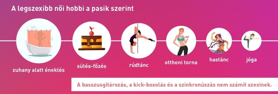 Minden negyedik pasi egyetért abban, hogy a legvonzóbb női időtöltés a zuhany alatt éneklés. Ezt szorosan követi a sütés-főzés és a rúdtánc, de szintén népszerű az otthoni tornázás, a hastánc és a jóga. Meglepő módon sem a basszusgitáros, sem a kick-boxos, sem a szinkronúszó lányok nem végeztek előkelő helyen a pasik által összeállított listán.