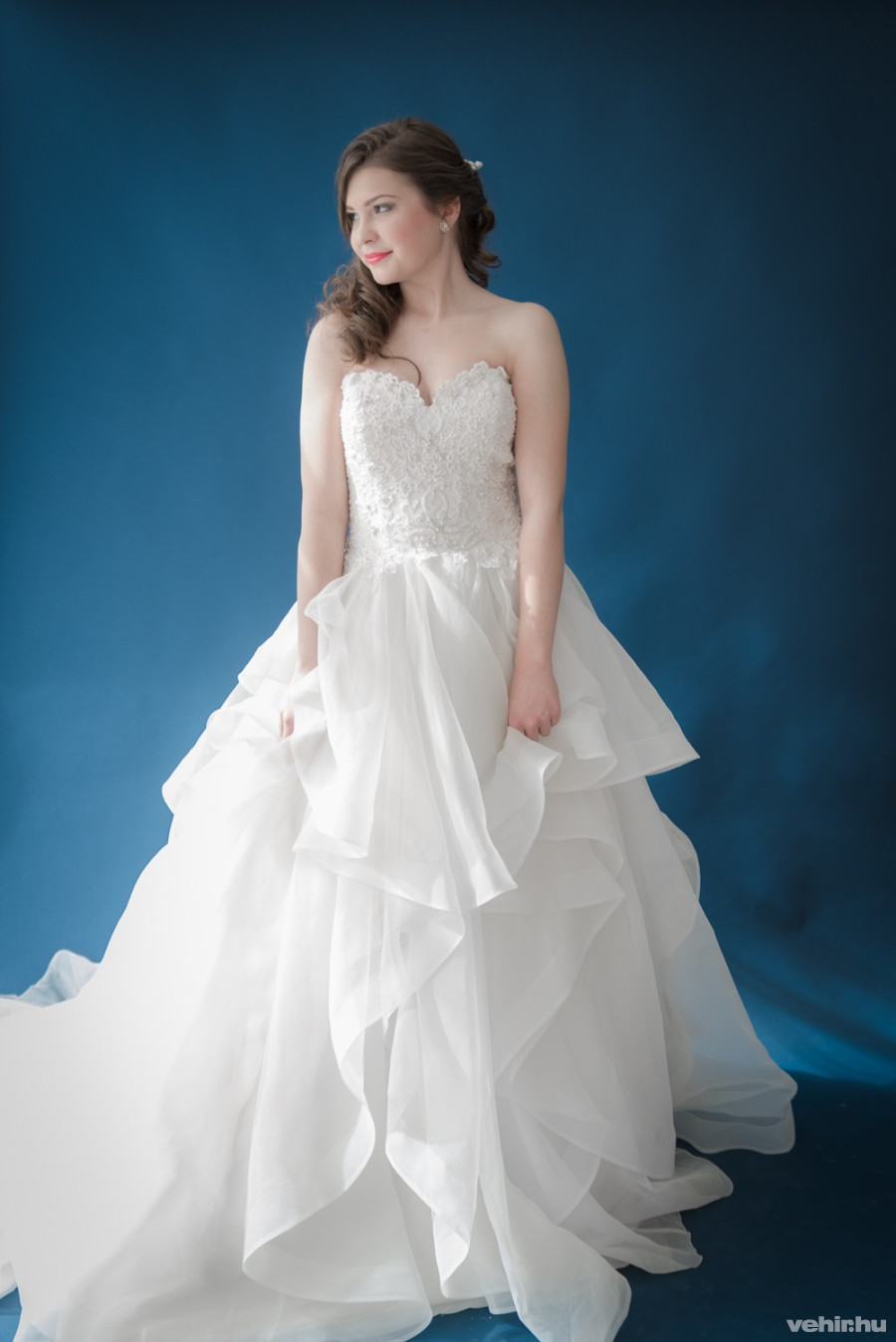 A különleges, negédes, szív alakú dekoltázzsal ellátott gyöngyös csipke felsőrész fantasztikus eleganciát kölcsönöz a ruhának, hullámos szoknyarésze pedig még különlegesebb hangulatot varázsol neki. A szoknyára szabálytalanul rávarrt fodrok, az uszály, az egyes rétegek eltérő hossza játékossá, és a többi nagyszoknyás menyasszonyi ruhához képest kivételessé teszik a márka darabját. Találóbb fantázianevet nem is kaphatott volna: az organza és a csipke házasítása, az anyag minősége, fajtája, a ruha kialakítása igazán csábítóvá teszik az összképet. Nem csoda, ha egyre több cég törekszik hasonló megoldásokra.
