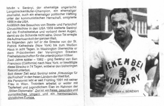 1960-ban azzal került be a hírekbe, hogy Nixon elnökválasztási kampányának keretében a New York-Washington távot „Remember Hungary” feliratú pólóban futotta végig, hogy „a Fehér Házig vihesse a rab nemzetek üzenetét.” A memorandumot át is adta Nixonnak, akkori alelnöknek. Élete legnagyobb kihívása azonban az volt, hogy egyfajta Forrest Gumpként 5000 kilométert gyalogolt San Fransisco és New York között, hogy emlékeztesse a világot Magyarország sorsára. Ez 74 nap alatt sikerült neki, a korábbi rekord 77 nap volt.