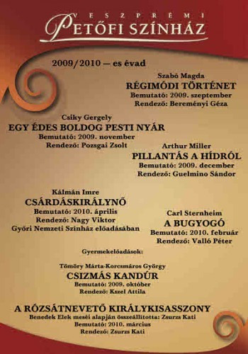 Szabó Magda Régimódi történet című művének színpadra állításával kezdik szeptemberben az új évadot; a darabot Bereményi Géza rendezi, a próbák már megkezdődtek. Bujtor István, a színház igazgatója az intézményben tartott sajtótájékoztatón elmondta, hogy a 2009-2010-es évadban négy nagyszínházi bemutató lesz, illetve bérletes előadásként a Győri Nemzeti Színház társulata a Csárdáskirálynőt adja elő. A veszprémiek "cseredarabja" Győrben az Indul a bakterház előadás-sorozata lesz. Mint elhangzott, az új évadban is tovább játsszák Veszprémben a rendkívül sikeres és pótszékes telt házakkal menő Hyppolit, a lakájt Szulák Andrea és Balázs Péter főszereplésével.
