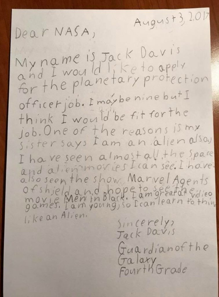 A magát csak "A galaxis őrzőjeként" aposztrofáló kissrác egy A4-es lapon fogalmazta meg, szerinte miért lenne tökéletesen alkalmas a poícióra.