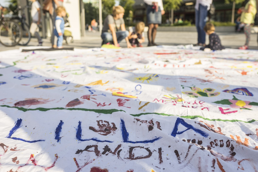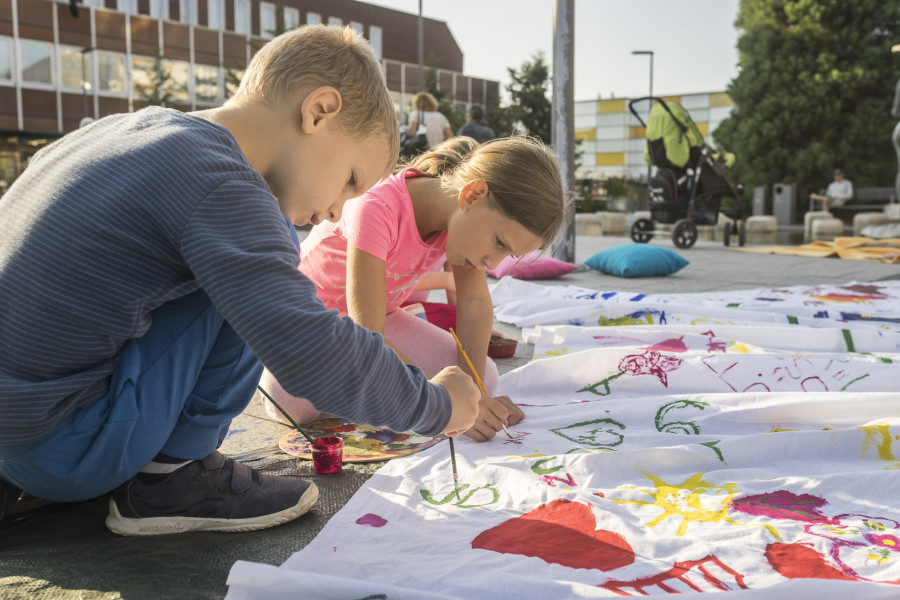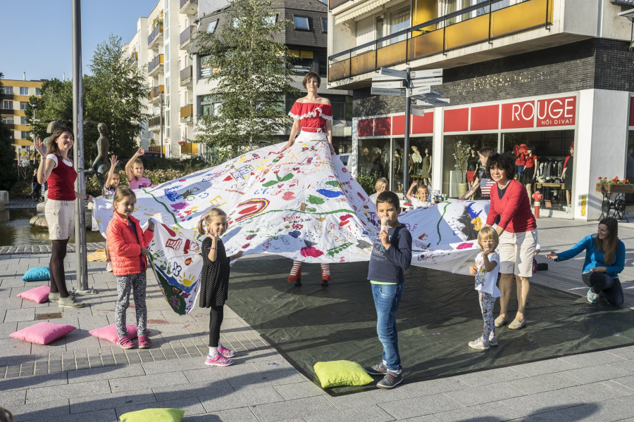 A második születésnapját ünneplő Gombrich Mester Tanoda a korábban már bevált szoknyafestésre várta a gyerekeket. Egy öt méter átmérőjű fehér textilt varázsoltak színesebbé az arra járók, az elkészült ruhadarabot pedig Lovászi Edina, a Kabóca Bábszínház egykori színésze gólyalábon mutatta be.