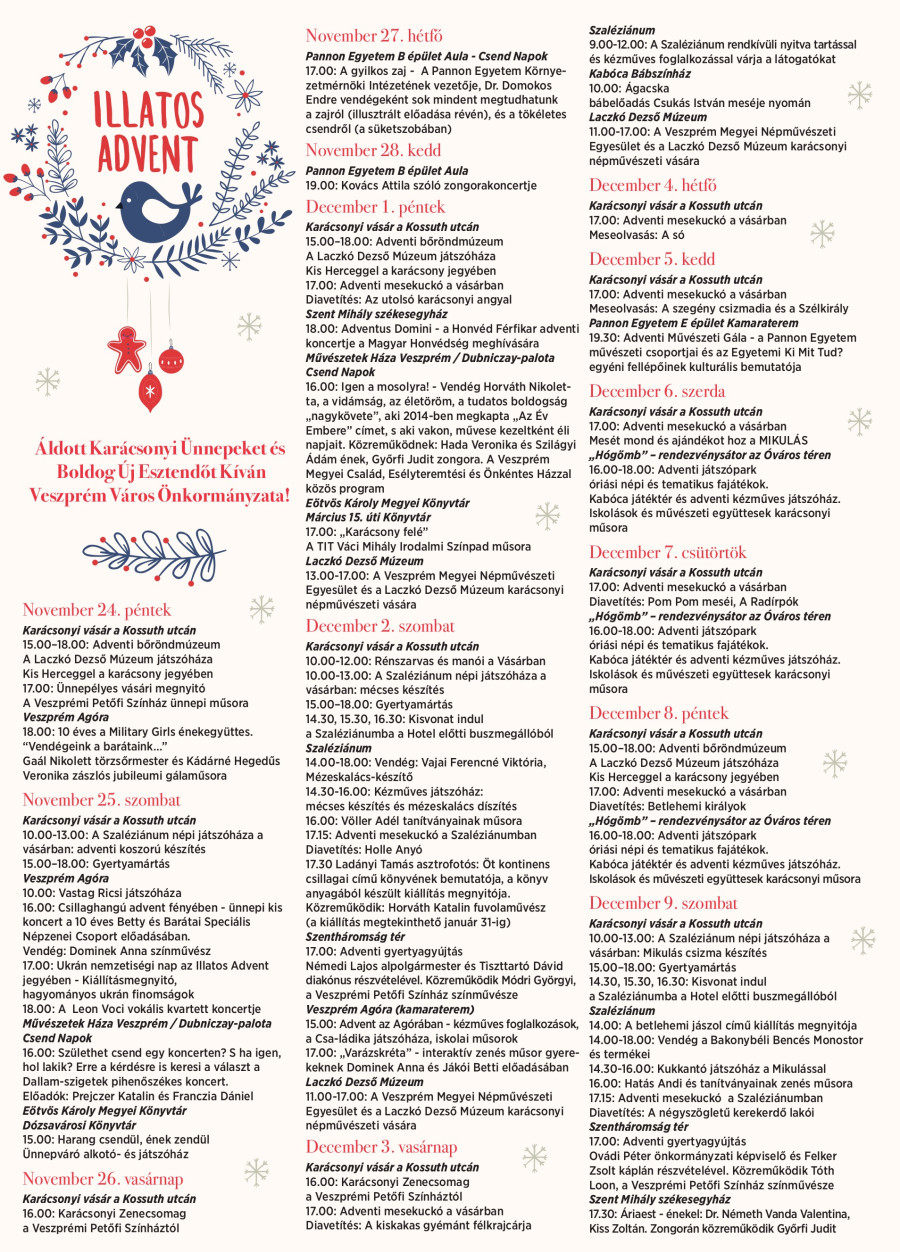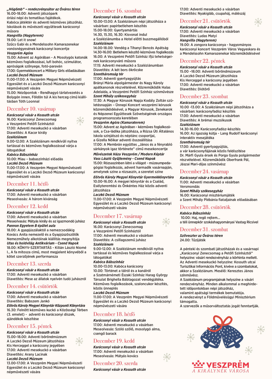 Megnyílik a Csodakert: november 30-tól minden vasárnap adventi programok várják a közönséget közélet Megnyílik a Csodakert: november 30-tól minden vasárnap adventi programok várják a közönséget November 30-án, 16:30-kor ünnepélyesen megnyílik a Veszprémi Petőfi Színház előtti téren kialakított Csodakert, amely különleges hangulattal és vasárnaponkénti műsorokkal várja az érdeklődőket. A kert mindennap látogatható lesz az előadások végéig, akár késő estig, és számos pihenőpontot, fotóhelyszínt, valamint a színház számára készített betlehemet is megtekinthetnek, átélhetnek a látogatók. 2025. november 26. 10:53 Nemzeti összetartozás napja: a magyarságtudatot nem lehet megtörni közélet Nemzeti összetartozás napja: a magyarságtudatot nem lehet megtörni Június negyedikén, fél öt után két perccel kezdődött meg az Óváros téren az első világháborút lezáró trianoni békediktátum aláírásának 105. évfordulójáról szóló megemlékezés. 2025. június 5. 11:23 Verancsics Faustusra emlékeztek közélet Verancsics Faustusra emlékeztek Csütörtök délelőtt ünnepélyes keretek között emlékeztek és tisztelegtek Verancsics Faustus emléktáblája előtt, melyről Abonyi János, a Pannon Egyetem rektora úgy fogalmazott, nem csupán egy történelmi emlék, hanem a város Európa szívéhez való szoros kötődésének és innováció iránti elkötelezettségének szimbóluma. 2025. április 24. 23:51
