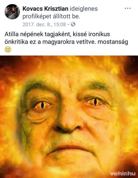 Kovács olyannyira rajong Soros Györgyért, hogy decemberben profilképét is a milliárdos arcképére cserélte a Facebookon. Azt írta mellé: “Attila népének tagjaként kissé ironikus önkritika a magyarokra vetítve mostanság” – a mellékelt fotó alapján ez alatt Soros démonizálását érthette a Jobbikos politikus.