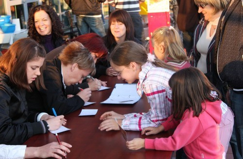 A szokatlan hideg ellenére összegyűltek a kézilabdabarátok az aréna előtt felállított színpadnál, és ünnepelték a sikeres veszprémi kézilabda évadot. A betonos lányok egy órán keresztül, nagy lelkesedéssel osztogatták az autógrammokat, majd elfoglalták a helyüket az első sorban, az MKB Veszprém KC képviselői mellett.