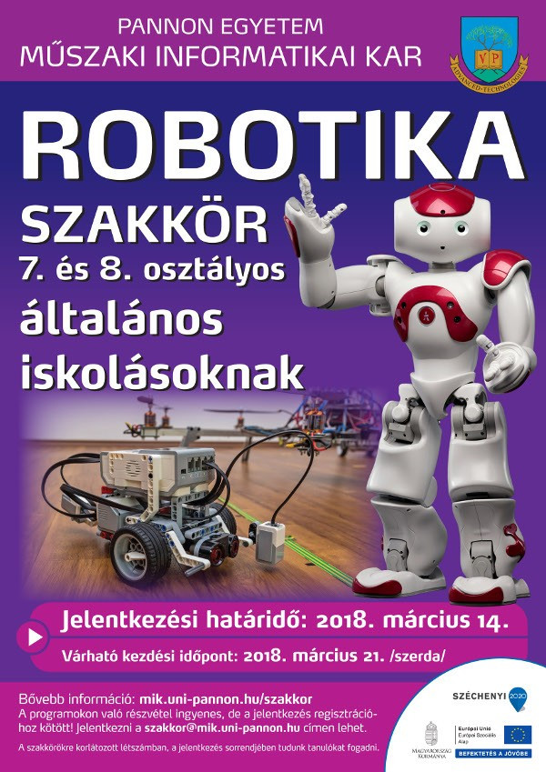 A Műszaki Informatikai Kar robotika/robotprogramozás szakkört indít általános iskolás 6-8. évfolyamos diákok részére. A programokon való részvétel ingyenes, de regisztrációhoz kötött! Jelentkezést ezen a héten még elfogadnak a jelentkező neve, jelentkező elérhetősége, iskola nevének megadásával a szakkor@mik.uni-pannon.hu címen. A foglalkozások szerdán 14.00-15.00 óráig lesznek.